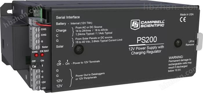 两路输入端子可以同时连接两种充电电源。PS200还引入了大功率点追踪算法,用于太阳能输入,大化可用的太阳能充电。RS-232 和 SDI-12 端子允许PS200将充电参数传送给数据采集器。